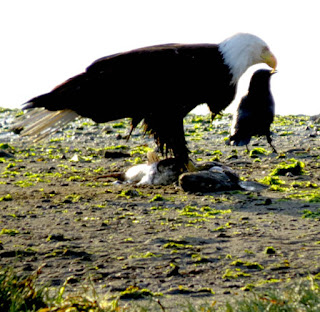 But -- thanks to the teacher who explained to me that a REAL photographer doesn't TAKE pictures, she MAKES pictures -- there's also the whole issue of where you position yourself when you're taking the shot. In this case, I saw the eagle from an upstairs window, but I snuck downstairs and crouched behind a canoe. And this, of course, is one of several shots -- mostly just the eagle, but I watched for that pesky crow to move into position. So patience is another ingredient...